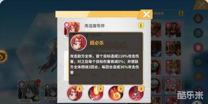 超必杀:攻击敌方全体,首个目标造成110%攻击伤害,对之后每个目标衰减5%,并使敌方全体燃烧3回合,每回合造成36%攻击伤害。
