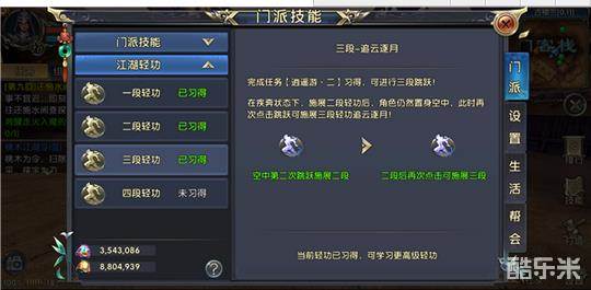 二段轻功完成后就可以开始学习第三段轻功追云逐月了,从这阶段开始任务难度开始加大。本阶段轻功任务一共分为四个步骤,下面跟玩家详细说明。