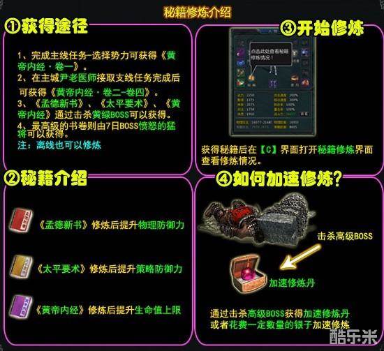 1、完成新手主线任务:选择势力后,水镜先生会送给大家第一本秘籍:黄帝内经·卷一。当进入主城,可以通过完成支线任务获取其他的书卷。