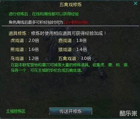 玩家在主城的华佗附近可以进行五禽戏的修炼,修炼时可以获得许多经验。在修炼时离线一样可以获得经验奖励!