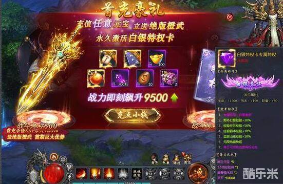 一、首先首充是一定要买的!前期送绝版橙武,没有这个之后的武器部位提升也无法进行下去了,首充赠送的白银特权增加各种经验加成,帮助您更快升级。