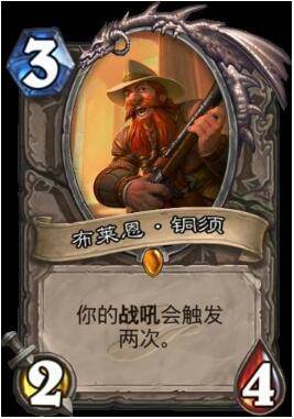 布莱恩·铜须,狂野多数卡组都会带的一张卡,当时有很多人毒奶过这张牌的强度,认为铜须会像瓦王一样慢慢变得无人问津,可惜毒奶没成功啊。铜须成为了年度使用次数最多的一张牌,额外战吼触发两次的效果是史无前例的,让单调的炉石获得了更高的可玩性,游戏的环境也变成了百花齐放的场面。铜须额外战吼触发两次,卡组上限提高了,娱乐卡组的强度也进一步提高,爆牌贼就是其中的典范,爆牌鱼配合铜须一次能爆4张牌,爆牌贼不管是苟活能力、斩杀能力都得到了史诗级增强,拥有了和主流卡组媲美的能力。直到现在,铜须依旧是入坑狂野的玩家的首选,设计师为了迎合玩家还设计了和铜须效果类似的鲨鱼之灵,铜须完全值得狂野玩家合成。