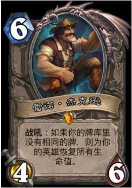 雷诺,宇宙体系的鼻祖。宇宙体系在初期强度并不是很强,每张牌都只能带一张,相应的控场法术、优质随从都受到了限制,只能带一张,没有和传统套牌那么稳定。雷诺无疑是给宇宙体系打了一剂强心针,一张超大的奶罐能为前期疲软,被快攻锤爆的宇宙体系恢复所有血量,让宇宙体系能获得重来一次的机会。但是这也让宇宙体系对雷诺变得过分依赖,没有雷诺在手的宇宙卡组会让玩家变得束手束脚,没法正常操作。不过幸好后来的版本不断在补强宇宙卡组的强度和厚度,宇宙卡组的代表58牧就可以说是改变了天梯,没有拉兹就没有伤害啊。