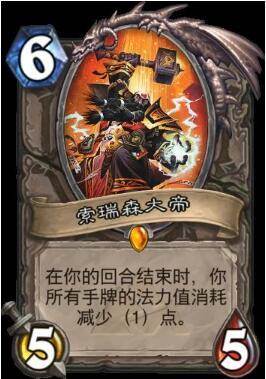 大帝,超级强大的一张橙卡,在回合结束时使你的手牌费用减一。索瑞森大帝在炉石的发展起到了决定性的推动作用,手牌所有费用减一意味着以前因为费用原因完成不了的OTK卡组有了上场的机会。炉石的环境又再一次出现了大变化,围绕着索瑞森大帝所构筑的一系列新的OTK和慢速卡组出现了。当然,后来的维伦牧、震爆牧都是其中的一员。如今狂野依旧强势的大哥牧曾经也有加入大帝的版本,可能是为了复活石的稳定而选择放弃了大帝。即使如此,大帝在狂野玩家的手中依旧有着不俗的价值,在将来大帝仍然会发光发热。