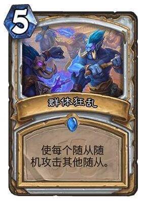 群体狂乱作为牧师现在必带的一张牌,很多的炉石玩家都把它当做一张解牌,能够在心灵尖啸没有到手之前,有几率清空对手的解牌。莲姐觉得完全可以把群体狂乱当成一张AOE来使用,但是这张牌的效果让随从的攻击次序完全是随机的,所以有可能对面的场面没有全部清空场面,还是比较看脸的一张牌。莲姐认为这张牌当成解牌来说非常的好,解场的条件和亵渎非常的接近。