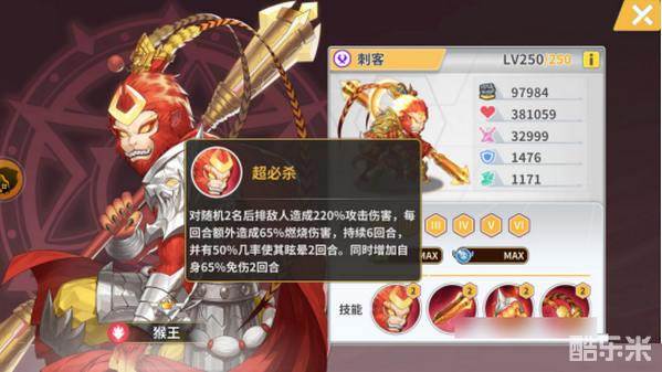 猴王:三阶攻击相对其它刺客高出3000,打后排,燃烧,眩晕,减伤,加攻击,生命,破甲,燃烧伤害加成,普攻100%眩晕。相当于普攻状态定住一个前排,