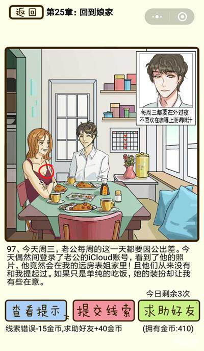 在再见吧渣男手游中回到娘家第96关究竟该怎么过呢?在这一关中相信很多小伙伴们都有同样的疑问,那么不清楚具体线索究竟是什么的话下面就来看一下吧~!