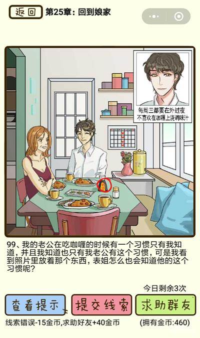 在再见吧渣男手游中回到娘家第99关究竟该怎么过呢?这一关中我们知道老公在吃咖喱的时候是有一个习惯的!但为什么表姐也知道呢?下面就来看一下吧!
