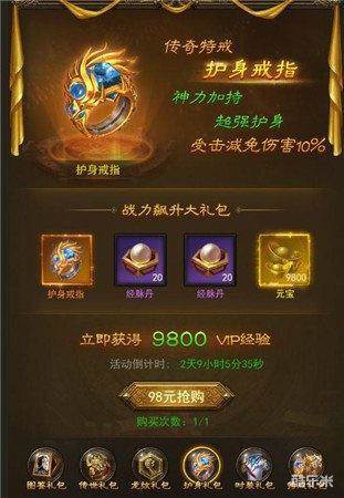 新服活动还有限时直购,有多种选择可全方位提升战力,只要充值98元,即可获得战力飙升大礼包,其中包括:护身戒指,20颗经脉丹*2,9800元宝,同时还能立即获得9800VIP经验,礼包中最值得一提的就是护身戒指了,作为传奇特戒,它具有神力加持,超强护身,受击减免伤害10%!