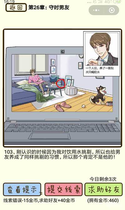 在再见吧渣男手游守时男友第103关中男友出轨的证据究竟在哪里呢?在这一关中我们知道男友因为我的影响所以对饮用水是非常挑剔呢!那么那个究竟是什么呢?