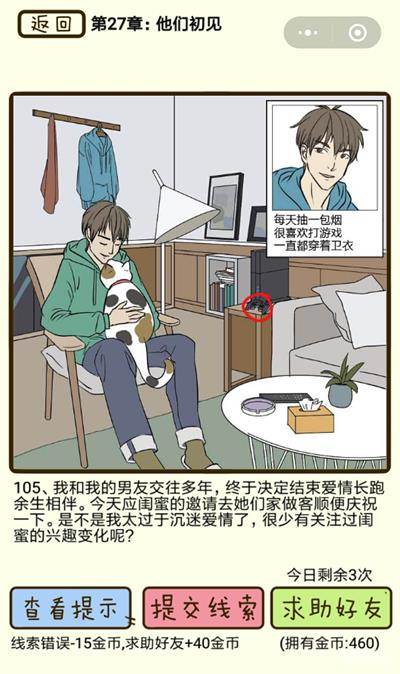 在再见吧渣男手游中他们初见第105关究竟该怎么过呢?在这一关中我们来到了闺蜜的家中做客庆祝一下,但我们是不是太沉迷于爱情了,没发现闺蜜的兴趣变化呢?下面就来看一下吧!