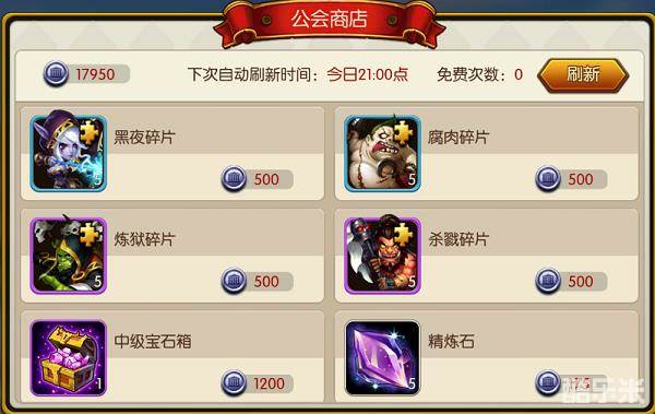 10、加入公会后记得捐献和打公会副本获得个人贡献币,公会商店会有不少好东东,可以兑换杀戮和炼狱这两个资质15的英雄碎片;