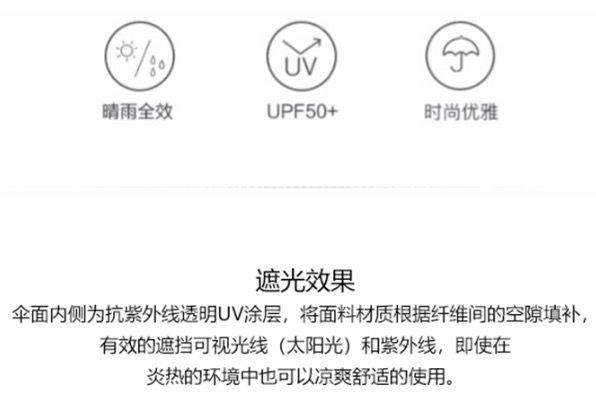 同时,雨伞也可以晴天使用,紫外线防护系数(UPF)在50以上,有效避免阳光中紫外线的过量照射!