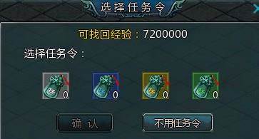 选择免费找回后,如果该任务是可以使用任务令的,则会弹出选择任务令的窗口,使用任务令能使找回的经验有额外加成。同样VIP玩家还可以使用银两找回,找回的经验将是100%哦!
