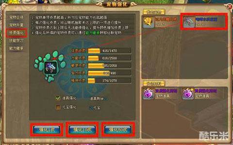 宠物除了可以合体之外,还能进行资质强化,宠物资质强化需要资质强化药剂,也可以使用元宝强化。资质强化也是要看运气的,每次强化都会提升2—25点资质不等。强化资质你可以选择强化1次,也可以进行批量强化,专为懒人设计的,10次或50次的强化。