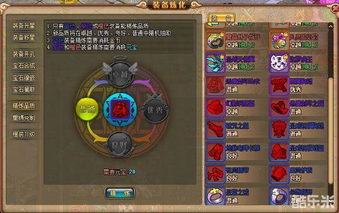 2、品质,每件装备有普通、良好、优秀和卓越4种,分别附加100%、110%、130%和150%的装备属性加成,一般的小R和非R选取优秀装备为佳,可以去禁绝使者处换,也可以去市场收购高品质的装备。有经济实力的玩家可以使用精炼品质,20元宝一次,随机选取一种品质。