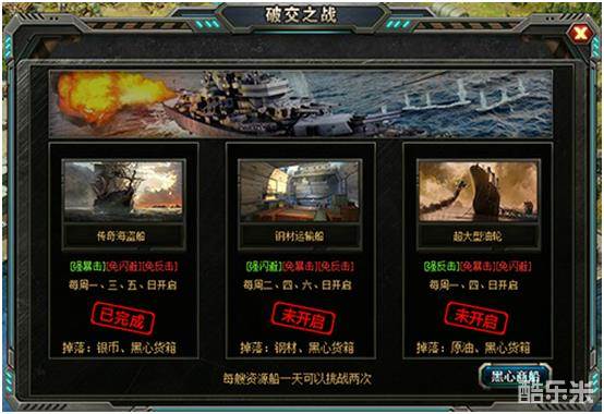 对于一名合格的海战指挥官,时刻都要准备着海上战斗,资源必不可少,而被资源所吸引的海盗自然会闻风而来,两者就会展开一场激烈的破交之战。在爱六娃《第一舰队》中,破交之战共有三种战役,分别为传奇海盗船、钢材运输船和超大型油轮,每艘资源船一天可以挑战两次,而根据船只的不同,我们可以获得的材料也都大不相同,这个玩法其实就是材料副本,通过不同的挑战获得不一样的海上资源,为舰队补充粮草,从而增强海上力量!