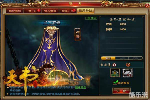 在大黑《天书世界》中,玩家开启披风系统后,可消耗材料进阶披风,并获得属性加成。进阶材料可通过打怪获得,也可在随身商店购买。玩家每次进行升阶都会增加幸运值,幸运值越高进阶成功率就越高,幸运值将于每日5点减半,因此玩家最好在材料充足时进行进阶,以确保进阶的成功性。