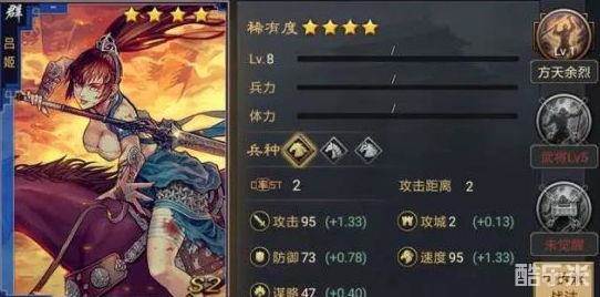 先看基础属性,攻击成长1.33,与同样是女将的关银屏1.52的攻击成长相比,吕姬的成长值并不算弱,属于比较优秀的水准,同为8级时初始攻击值甚至比关银屏还要高出五点。防御值中规中矩,谋略值则比较低,不过对她自身的影响并不大。