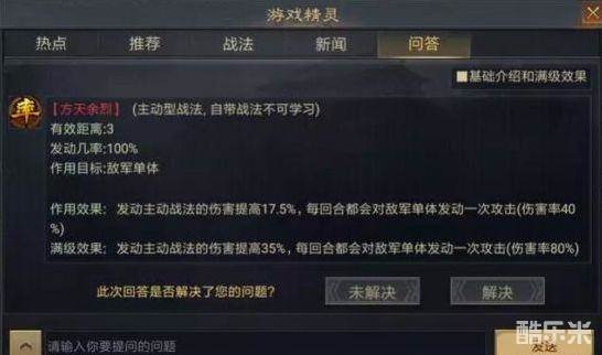 【方天余烈】加成效果覆盖了自身发动的所有主动战法,数值高于关银屏但低于夏侯渊,不过夏侯渊70%的加成效果只对每回合第一次攻击起效,而吕姬每回合可以发动一至三次主动战法,因此从加成效果来看,【方天余烈】完全可以与【虎步关右】分庭抗礼。