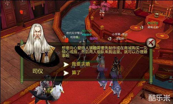 (4)找到NPC点结婚,与司仪对话选择求婚,然后司仪会在世界上喊“屌丝逆袭成功,要和XX举办婚礼了!”,之后就完成结婚了,不但有专门的夫妻称号,也有相应技能。