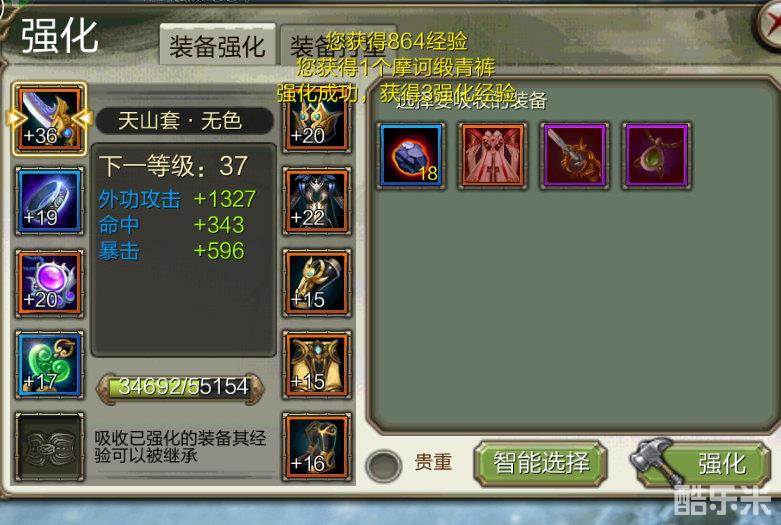 装备的强化需要用“玄铁”来强化或者吸收其他装备来获取装备经验,从而提升装备的强化等级。