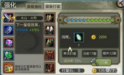 装备的打星需要用商城购买的“打星石”道具进行,分为白、绿、蓝、紫、橙五级,每个级别可打12星,比如白色档打满12星后,可以打绿色档12星,一直到橙色档12星封顶,打星成功后对装备的基础属性会有一个百分比数值的提升,打星所带来的加成非常可观!