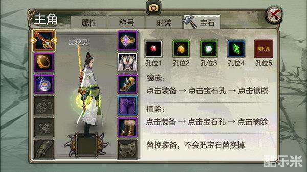 左边的装备对应的是攻击宝石位,右边的装备对应的是防御宝石位。每个位置可打五颗宝石,并且宝石系统与装备系统是独立的,即就算对应位置没有相应的装备你也可打上宝石并激发宝石的属性,而且换装不影响宝石的属性,另外宝石可随时拆取、随时镶嵌,仅收取少量的金币费用。