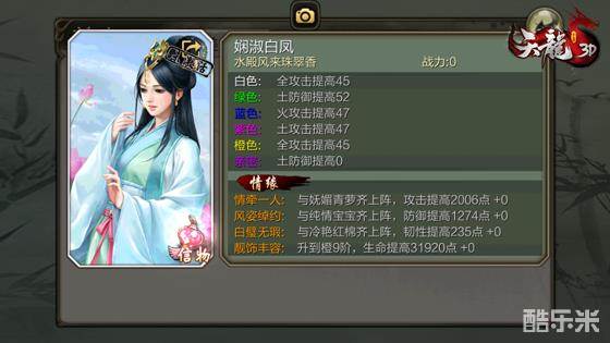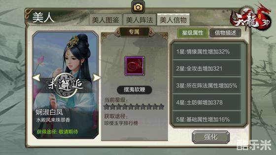 除了美人本身能对不同属性进行提升,如果你能够收集到美人心仪的信物,各项加成又将成倍增长!想要美人战力高,还是得用信物博取美人一笑啊~