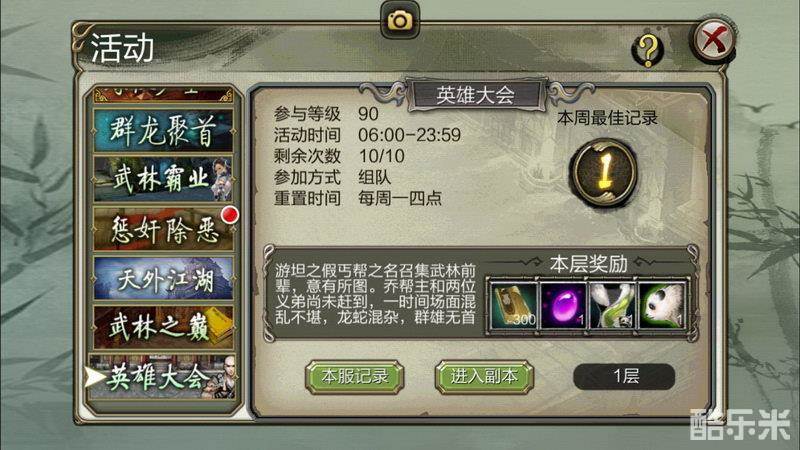 玩法:一周拥有10次挑战机会。在这里强调下:在5分钟内挑战成功,可以开启下一层的挑战。每周通过的层数越高,奖励越好。周一早上4点刷新前一周的挑战次数和挑战记录。