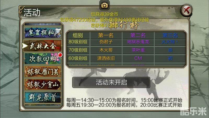 玩法介绍:所有江湖侠客齐聚一堂,一较高下,武林大会按等级分段,全员皆可参加。报名成功后进入等待极端,等待快接近开始的时候,系统会为玩家匹配对手,也是在武林大会第一轮将要对决的人,匹配后就是开战。玩家需要在众多同等战力玩家中杀出重围,胜者可以获得伙伴技能书宝箱、一品升星丹、高级装备等珍稀道具。