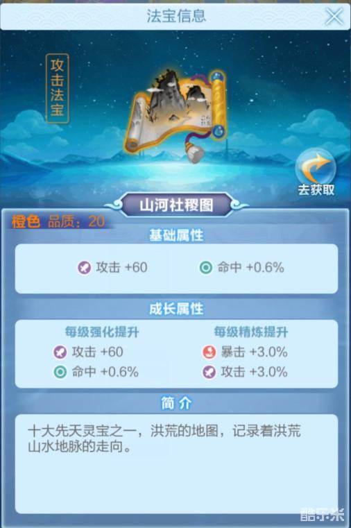 不同法宝的强化属性和精炼属性也会有所差别,比如橙色法宝山河社稷图强化升级会增加固定值的攻击力和百分比的命中,则精炼之后会增加百分比的暴击和攻击,反之另一橙色法宝先天五色旗强化则提升攻击力和暴击率,而精炼提升攻击和命中率。防御型宝物则增加生命值、闪避率和抗暴率。