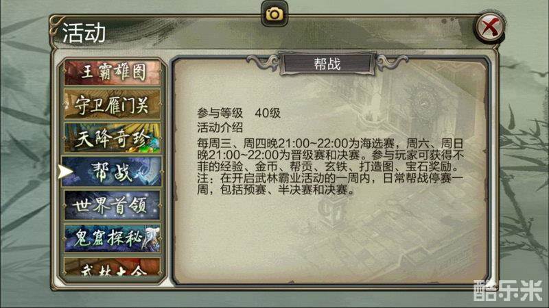 参加条件:所有40级以上玩家,均可代表各自帮会参加帮战海选赛。每个玩家最多可以进行10次战斗。