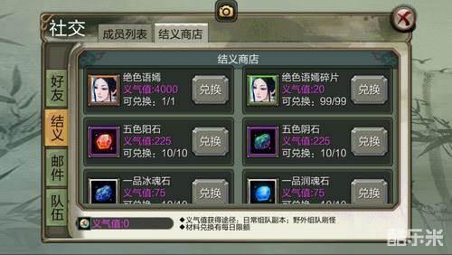 义气值可在结义商店兑换美人、美人碎片、魂石等道具;
