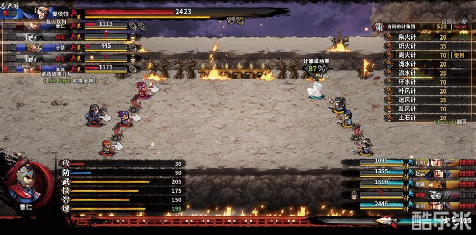 不过敌人的伤害极高,如果不点燃柴堆的战役难度大大提升,夏侯惇的麒麟也基本用一次就能秒杀我方一名武将。这里建议玩家将等级练到20左右,然后多备一些回生丹,有人倒了就迅速拉起来。战斗中也集中火力以消灭一个单位为主,等对面人少了就好打了。