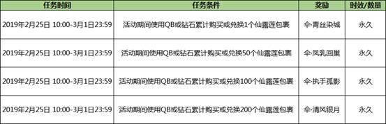 执伞千年等待与你齐眉相守,大家可在商城中购买仙露莲,开启不同规格的仙露莲可以获得对应数量的抽奖道具,并于2019年2月25日10:00:00—2019年3月1日 23:59:59期间,前往跨区广场找到活动入口参与宝藏的探索。