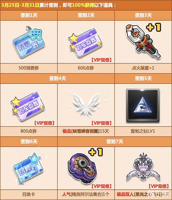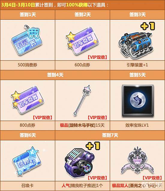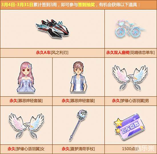 3月4日起,每天登录游戏完成签到任务,最高可获得11200点券奖励、人气道具、极品A车和双人座椅福利!每周签到达到指定天数,可免费领取极品双人座椅【圣光之心飞椅】、极品【旋转木马手杖】、极品A车【幻影绝尘】、极品【迷雪念轩套装】和丰厚的点券奖励。累计签到三周,还可以免费抽取永久A车【风之利刃】、永久极品双人座椅【花晴依恋单车】、永久极品套装【慕思烨轻套装】等惊喜奖励!
