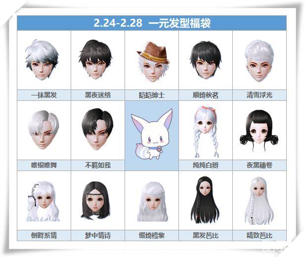 2.24-2.28,一元发型福袋限时上架商城,永久黑白款发型只要100金币,就能轻松带回家!本次福袋男女款各新上两款发型!男款:(一抹黑发、黑夜迷络),女款:(梦中情诗、夜黑穗卷)活动期间,每人限购两次福袋哦!