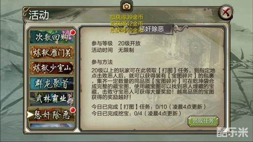 副本玩法:20级以上的玩家可在此领取【打图】任务,到指定地点击败恶人后,就可以获得装有【宝图碎片】的包裹,集齐一定数量的同品质【宝图碎片】可在乾坤袋合成完整的藏宝图,使用藏宝图可以找到恶人埋藏的宝藏,击败守宝恶人可获得大量奖励!越高品质的宝图获得的奖励越好!