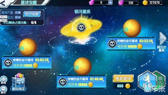 ②搜索星球,大概率搜索到金币星球。每个星球可开采的金币数目不同,可以根据自身战力选择开采的星球。占领或掠夺星球成功后,设置守卫保卫星球,坐等收晶石。在开采时间结束后就可以来收金币了。