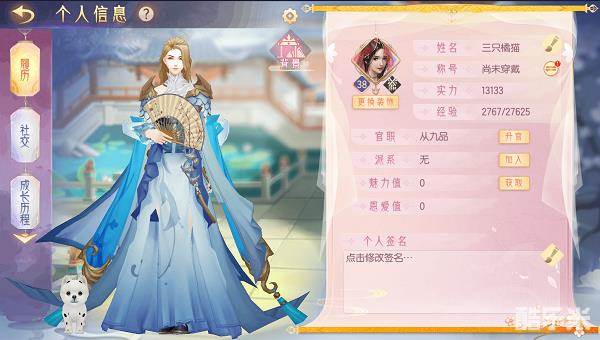 进入个人信息界面后,可以看到个人履历,履历中包含一些基本的信息,包括官品、派系、魅力值和恩爱值等,界面右下角还可以在履历界面修改自己的个性签名。此外点击人物形象的右上角还可以进行背景调整。