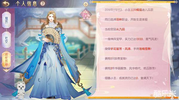 在成长历程中,可以看到小主进入宫闱的日期,选择的职业,到达的官品,拥有的宠物、时装等信息,这里记录着小主在凤歌成长的点点滴滴。