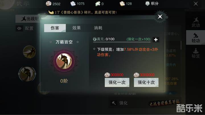 @强化轻功技能的三个方面:这是大多数人,最最最容易遗漏的地方,轻功配置打开,可以强化轻功技能的伤害、效果和消耗。加的修为很多。