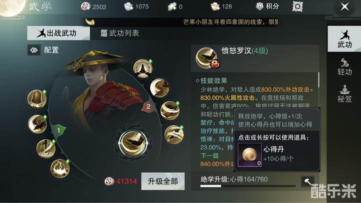 @升级绝学:绝学用心得丹升级,心得丹可以在论剑每天满5次,通关侠士以上难度副本等任务中领取,记得拿来用,不要当药一样放在包里,也不要扔掉…