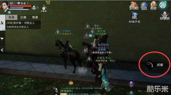 玩家达到指定位置,走到马匹附近,会出现红圈内的抓捕按钮,点击抓捕即可。
