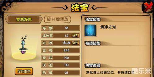 虽然罗悲净瓶的属性不是很强,但它的效果足以弥补它的弱势,建议大家刷一个极品,升到满级,属性最好是金木(当然也不用强求)。