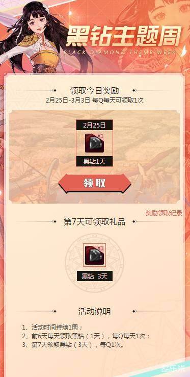 2.前6天每天领取黑钻(1天),每Q每天1次;
