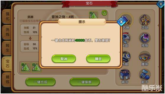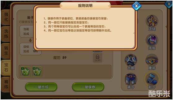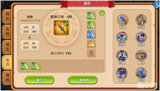 在镶嵌宝石之前别忘记了先合成一下低级的宝石噢,因为我们的宝石镶嵌槽数量有限喔,需要尽量镶嵌高级的宝石噢!