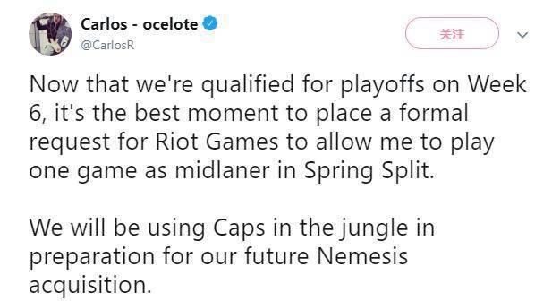 Ocelote在个人推特上表示,在常规赛第六周时,队伍就已经锁定季后赛名额了,因此,这是他秀技术的好机会。他决定向拳头游戏申请,允许自己在春季赛中上场打一次中单位置。Ocelote决定将首发中单选手Caps赶去打野位置,让自己有上场机会,他还调侃地表示,这是为了锻炼Caps的个人能力,为他们将来引入FNC战队现任中单选手Nemesis做好准备。这也是继王思聪之后第二个要上场打比赛的老板。