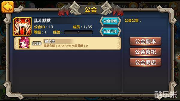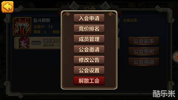 公会大厅:公会信息及公会成员信息的页面,成员可以根据权限点击公会管理按钮进入公会管理页面,还可以在公会页面中直接发出好友申请以及退出公会。